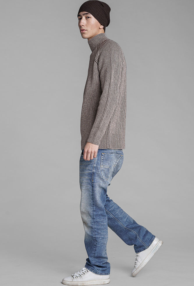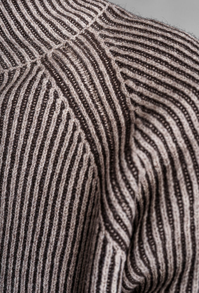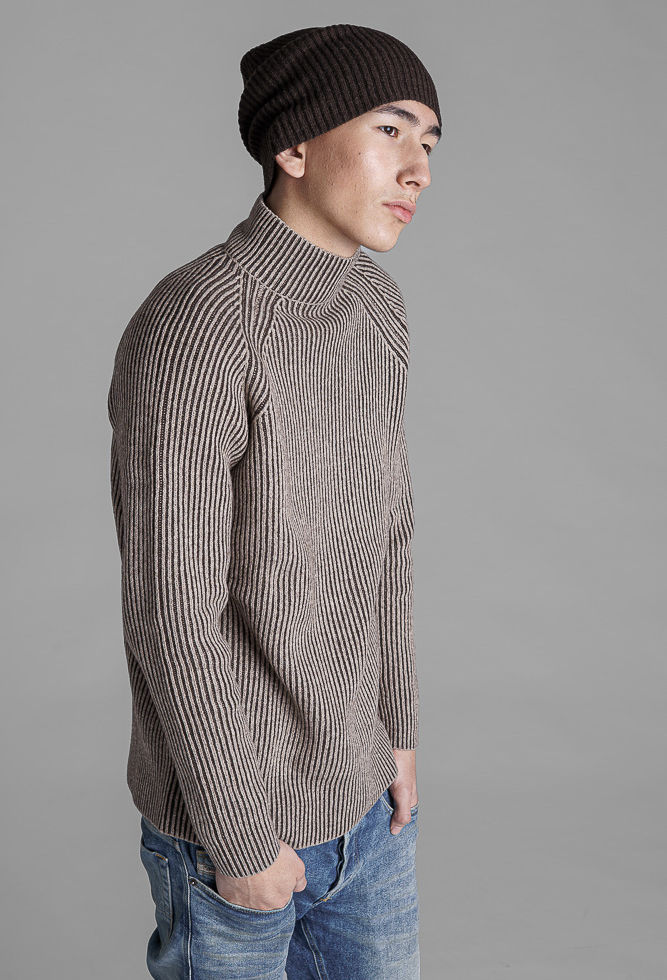 BARS ist ein gestreifter Rollkragenpullover aus Yak-Wolle. Die Kombination aus Schokobraun und Taupe verleiht ihm Tiefe und Ruhe.